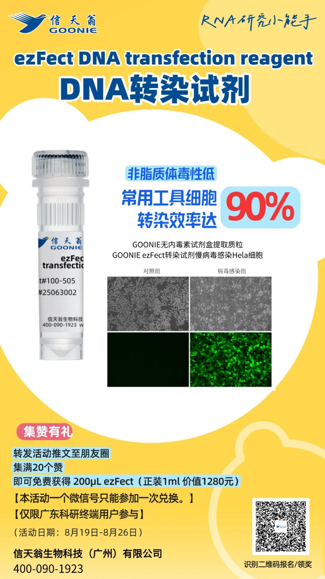 将本文转发至朋友圈,集赞20个,即可免费领取200μl转染试剂ezFect DNA transfection reagent。