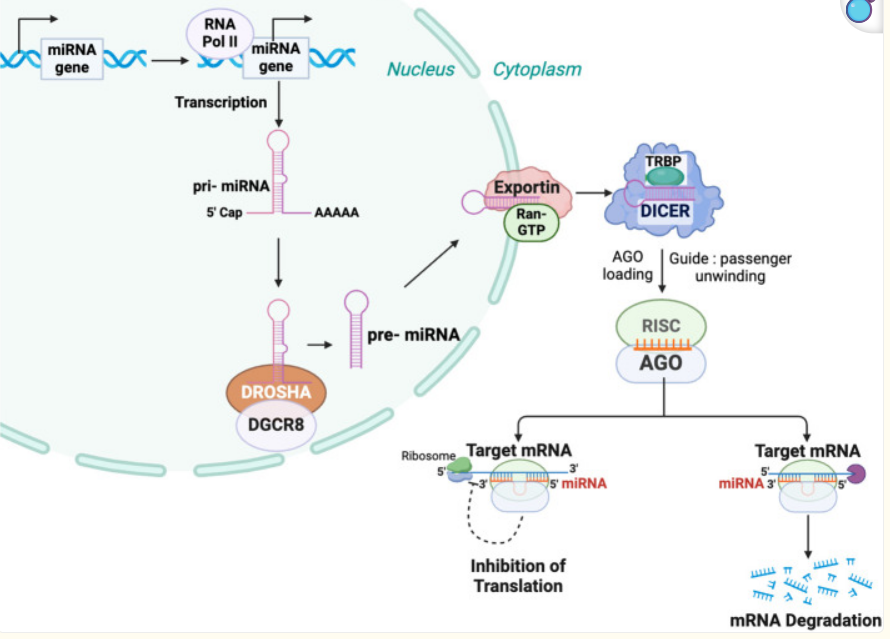 miRNA的生物合成始于由基因组DNA编码的初级转录本(pri-miRNA)。该转录本先后经过细胞核内Drosha酶复合物与细胞质Dicer酶的两次切割,最终在胞质生成成熟的miRNA单链。