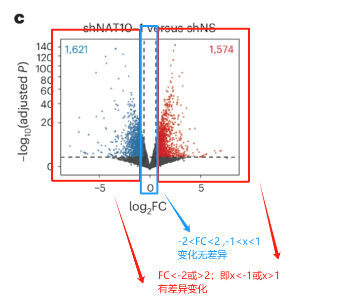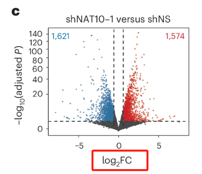 横坐标写的是log2FC,FC其实是Fold Change的缩写,也就是变化倍数,所以这里的横坐标取的是变化倍数的2的对数。