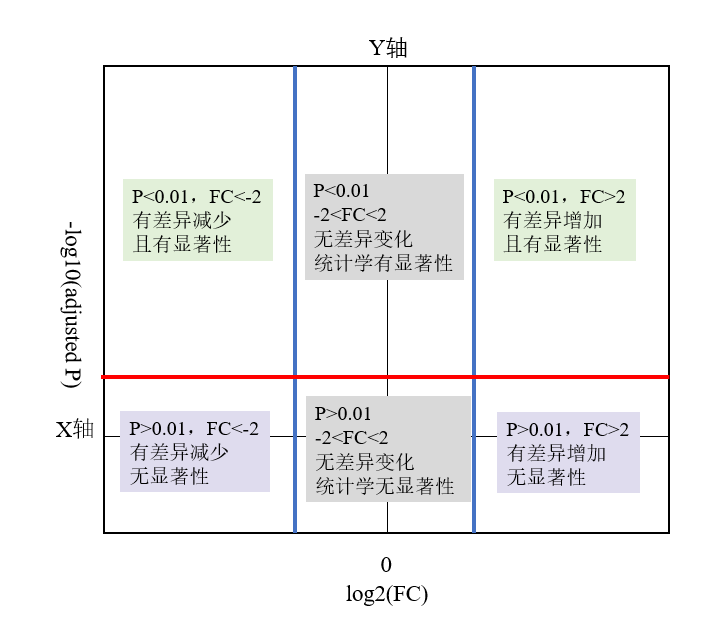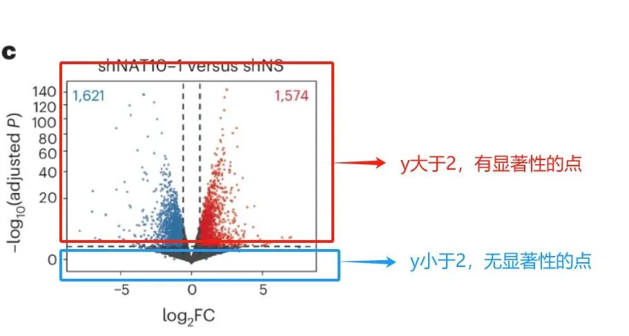 这是一个递减函数,当p值越小的时候,y值越大,所以取p小于0.01,就是取y值大于2,图里的点就可以分为统计学有显著性的点和无显著性的点。