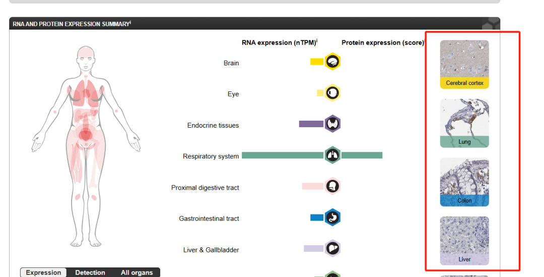 回到刚刚的页面,再往下可以看到PROTEIN EXPRESSION OVERVIEW,可以展示在各个器官中目的蛋白的表达情况。