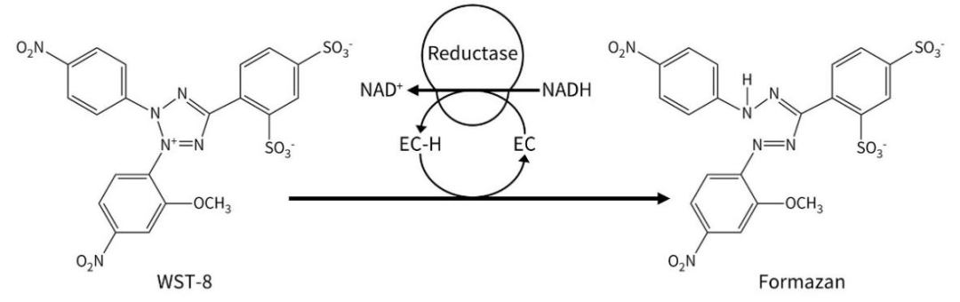 CCK-8(Cell Counting Kit-8)是一种基于WST-8的试剂盒,广泛应用于细胞增殖和细胞毒性的快速、高灵敏度检测。WST-8在电子耦合试剂存在的情况下,被线粒体内的脱氢酶还原生成高度水溶性的橙黄色甲臜产物(formazan),其颜色深浅与细胞的增殖成正比,与细胞毒性成反比。
