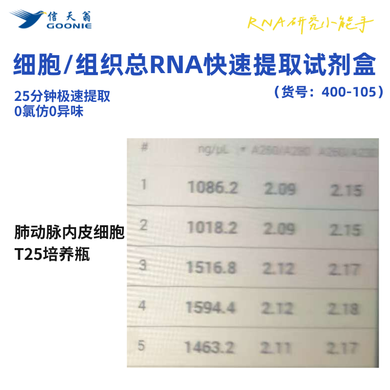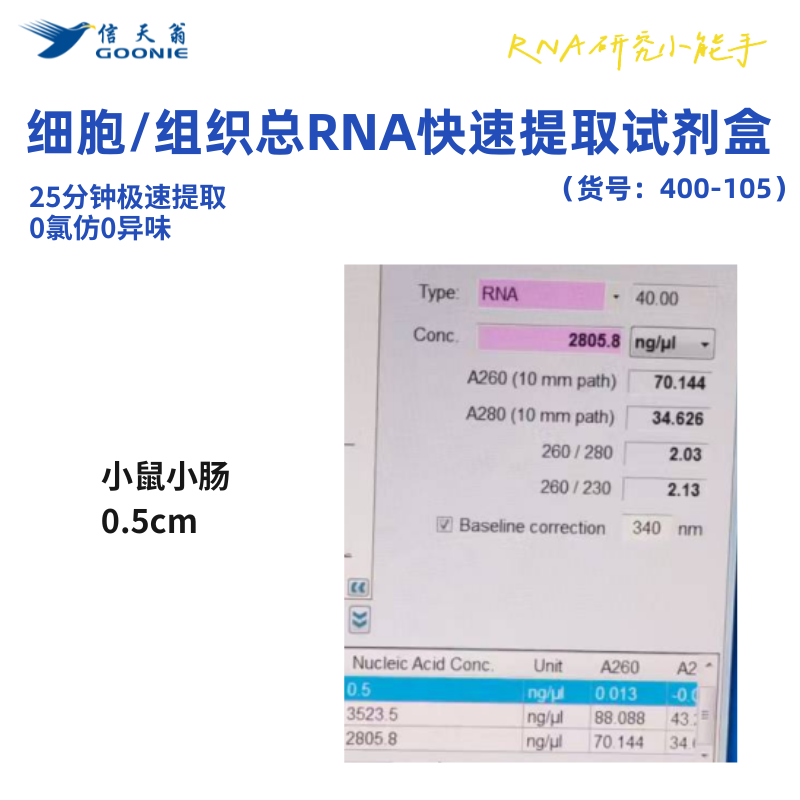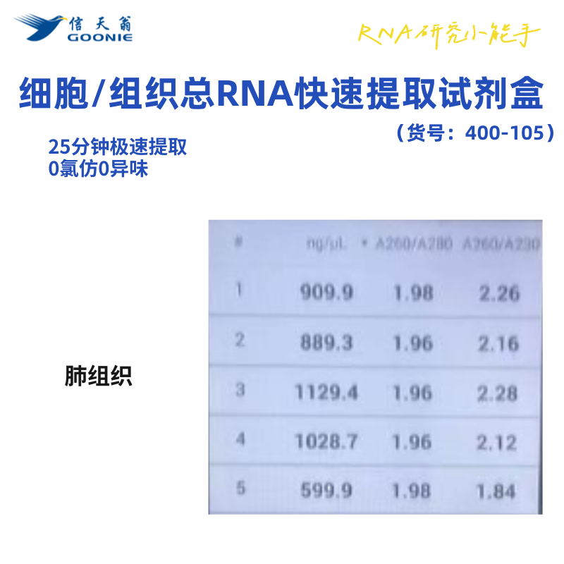 本试剂盒适用于从细胞、动物组织样品中快速提取高质量的总RNA。本试剂盒裂解液含异硫氰酸胍和酚,能迅速裂 解生物样品并失活RNA酶,确保RNA提取的完整性。本试剂盒操作简单快速,性能稳定可靠,不使用氯仿,也无需 进行耗时的醇沉淀,整个提取过程约25分钟,所提RNA产量大纯度高,适用于RT-PCR 、RT-qPCR、Northern、基因 表达芯片分析、高通量测序等实验。