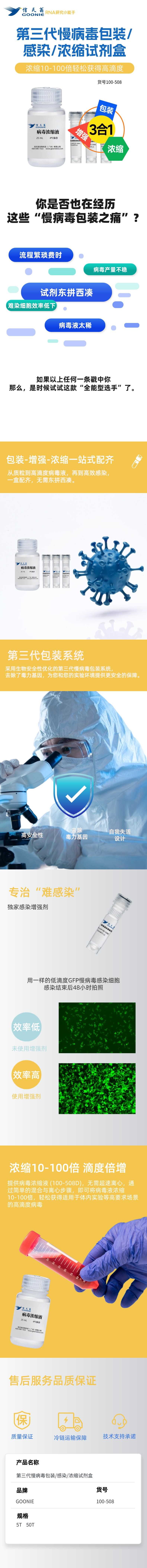信天翁第三代慢病毒包装/感染/浓缩试剂盒由加强了生物安全特性的第三代慢病毒包装辅助质粒混合物、DNA转染试剂,病毒感染增强剂,病毒浓缩液组成。使用第三代的慢病毒载体包装病毒,可将 载有目的基因或shRNA的表达克隆包装成为具有转导效果的病毒颗粒,包装所得的病毒颗粒可介导目的基因或shRNA在哺乳动物细胞中高效表达。