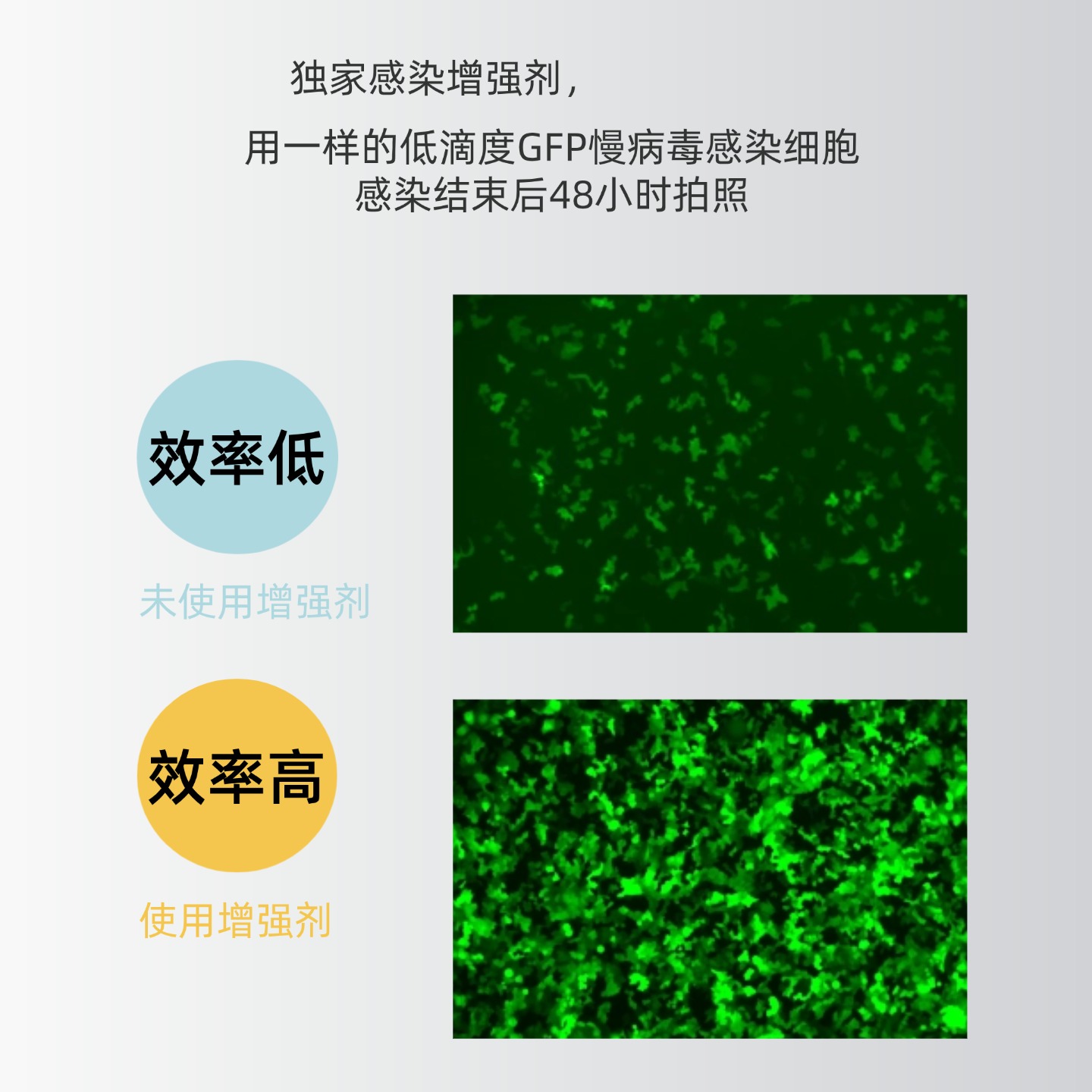 根据目的细胞的MOI加入适量的病毒和新鲜培养基,按照1:2000的比例加入病毒感染增强剂 ( 组分100-508C),即10mL 培养体积加入5μL病毒感染增强剂。先吸掉旧培养基,加入用9mL 培 养基稀释的病毒。再用1mL 培养基稀释5μL病毒感染增强剂,再均匀散布加入培养皿,轻轻摇晃 以混匀。感染24-48小时后,更换为新鲜培养基。若进行药物筛选,再培养12至24小时以让细胞 表达抗性基因。
