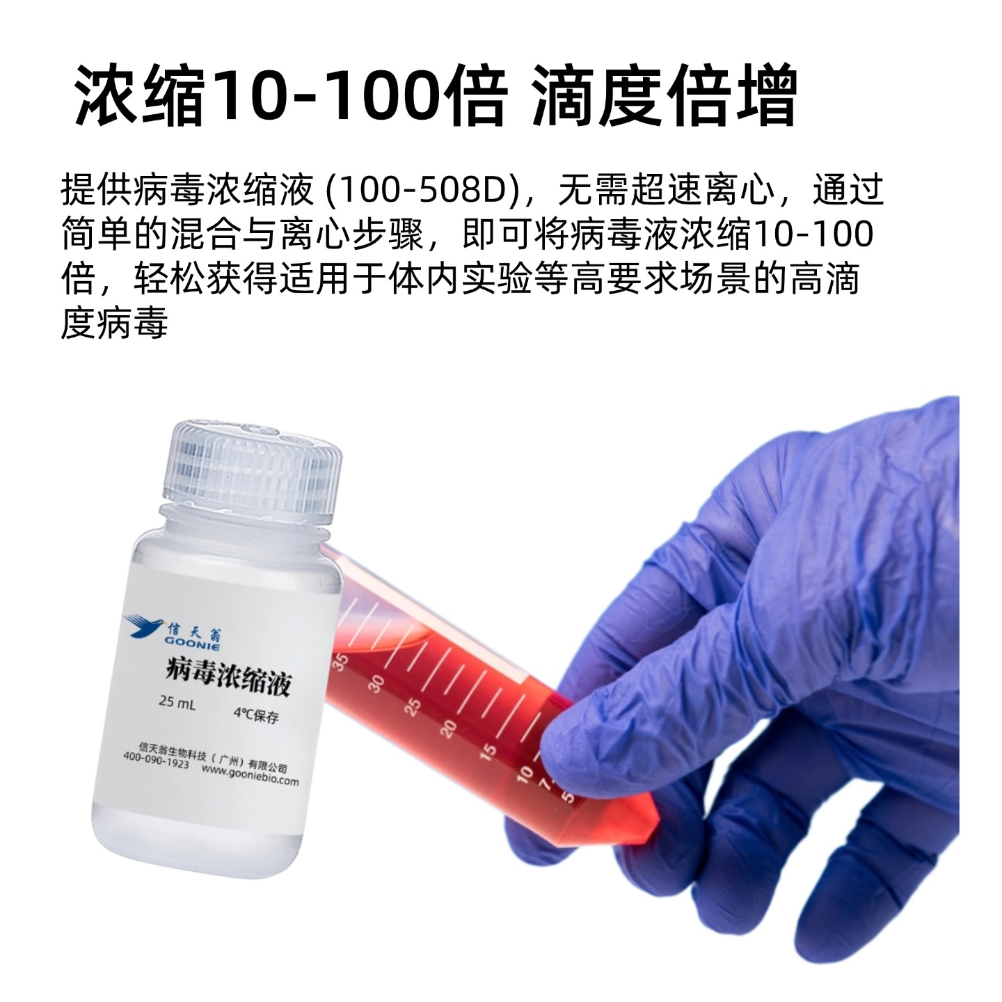 将慢病毒上清与试剂盒中的浓缩液(组分100-508D)按照3:1的比例混合(上清液3份,浓缩液1 份),4℃孵育4 到6 小时或过夜。初始阶段每隔30 分钟混匀一次。孵育结束后,4000×g ,4℃ , 离心30分钟,弃上清。用初始体积1/10 - 1/100的DMEM或PBS重悬病毒颗粒,吹打均匀,保存于-80℃。