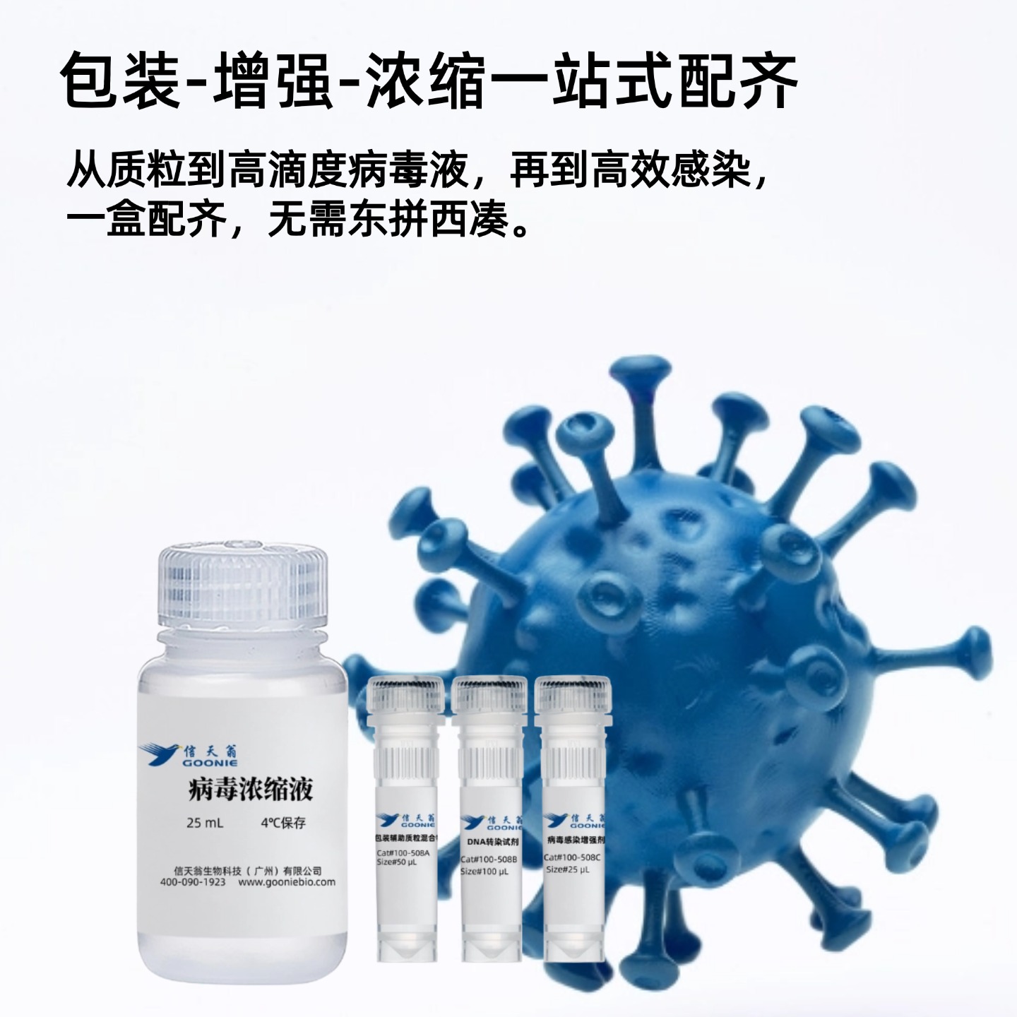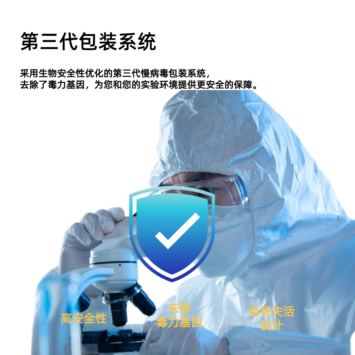 本品具有高安全性,操作简便,包装迅速、高病毒滴度,一站式配齐全套试剂的优势。一个试剂盒 可以用于5个10 cm细胞培养皿或25个35 mm细胞培养皿的HEK293T细胞生产病毒。和市售大多数病毒感染试剂盒不同,本产品还包括了感染增强剂,浓缩液以及对应的操作指南,不用再额外购买, 一次性配齐了慢病毒从包装到感染的全套试剂。