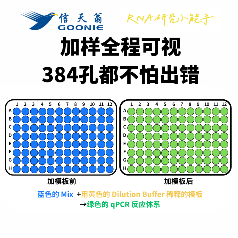 本产品为包含 SYBR Green Ⅰ荧光染料的 2×即用型预混 Mix,Mix 中含有蓝色染料,其核心组分为高效抵抗抑制的 Taq 酶,使用时只需加入引物、模板、水,使其工作浓度为 1×即可进行 qPCR 反应。此外,本产品还提供一种黄色染料 10×Dilution Buffer,利用不同染料混合后产生的变色效应来追踪移液过程,实现模板可视化,从而可以根据液体颜色来准确判断是否已加入模板(蓝色的 Mix+用黄色的 Dilution Buffer 稀释的模板→绿色的 qPCR 反应体系)。