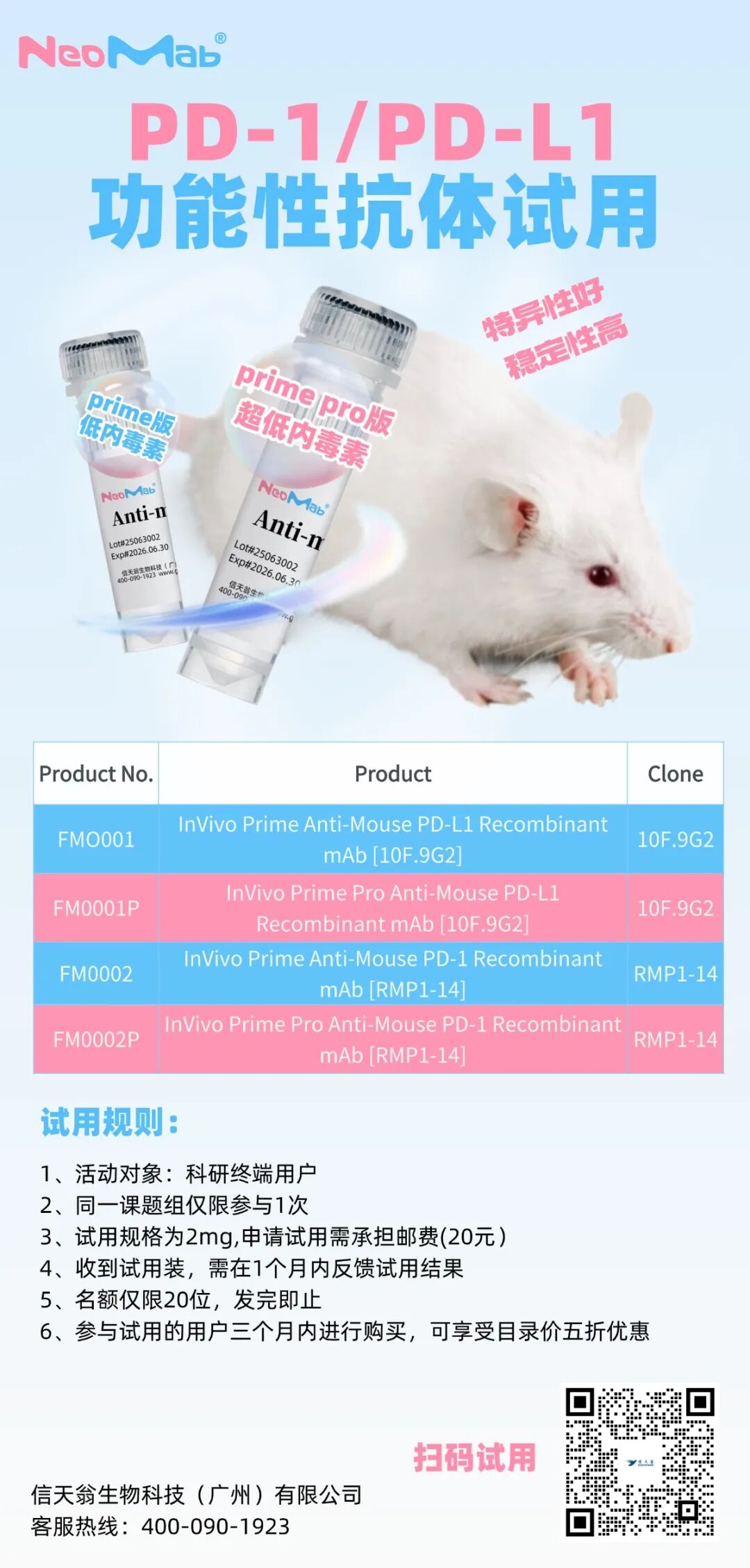 我们现推出抗小鼠PD-1/PD-L1抗体试用计划,为您提供足量进行预实验的样品。