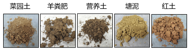 1:菜园土;2:发酵羊粪肥;3:营养土;4:塘泥;5:林下红土