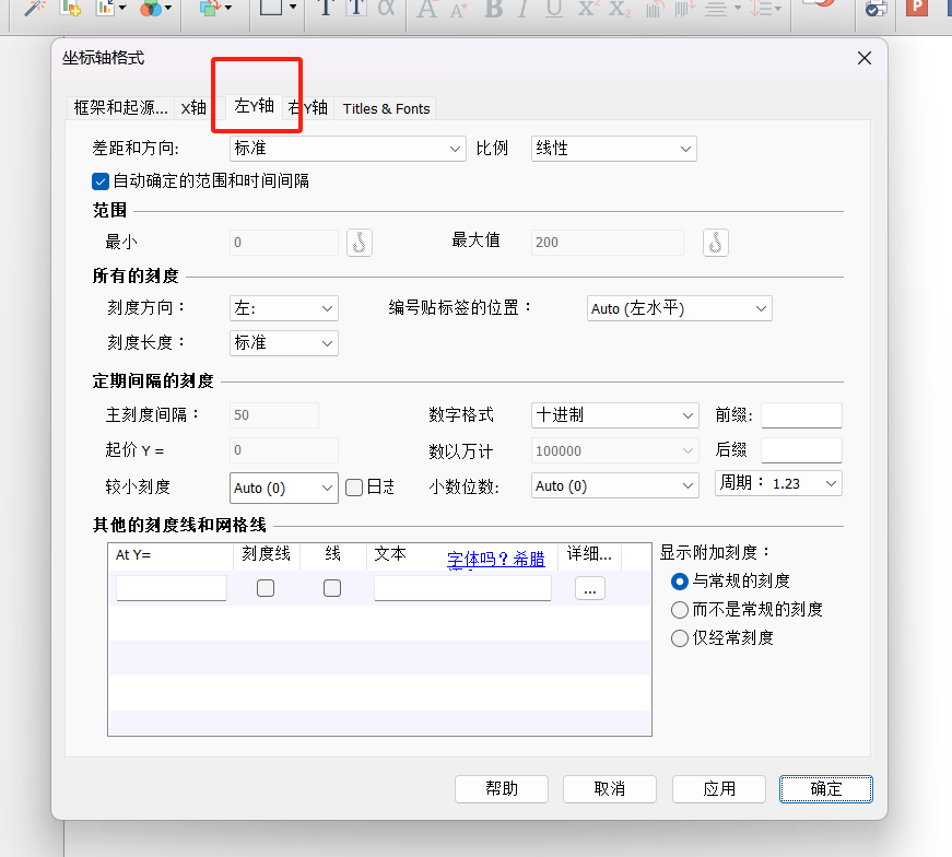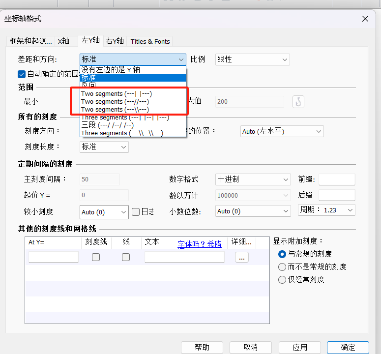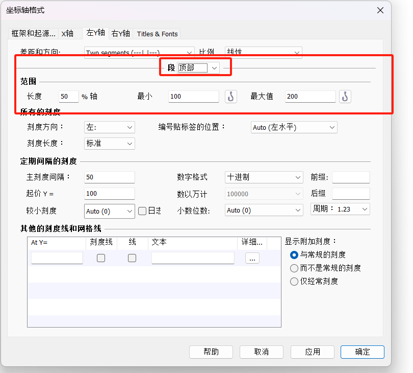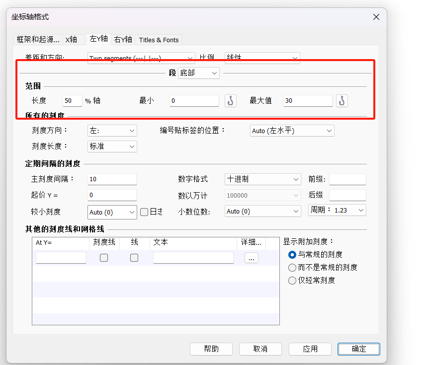 设置参数,我们看到框框里显示底部,这是指下面的参数是截断Y轴的下半部分的参数。