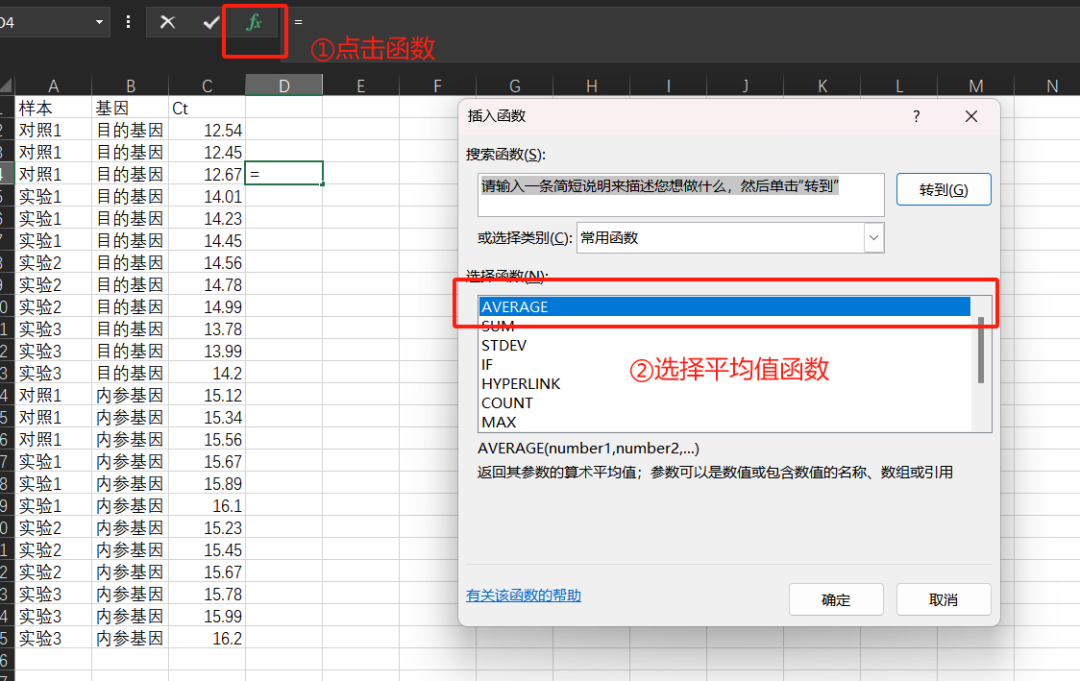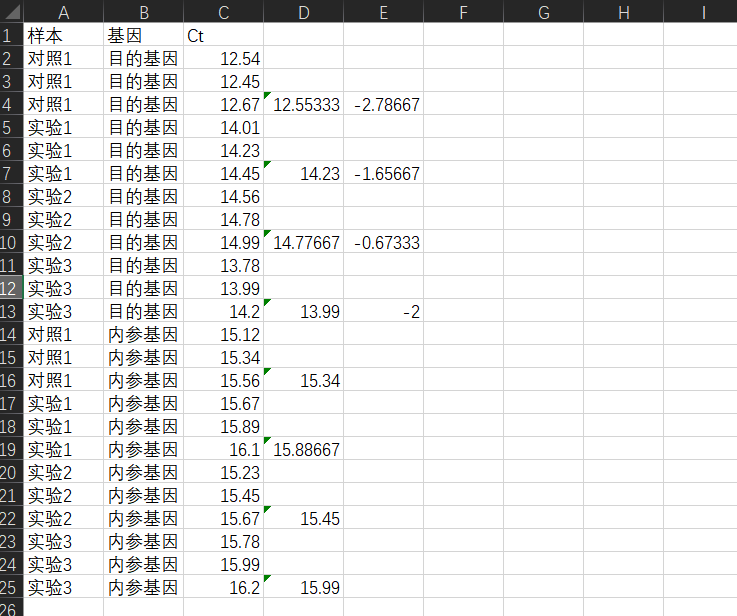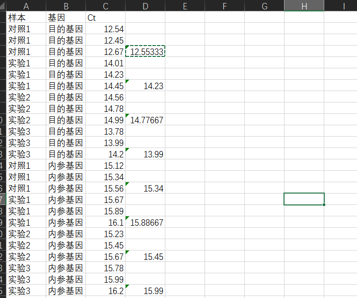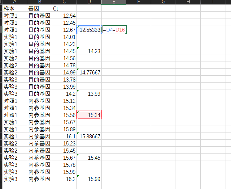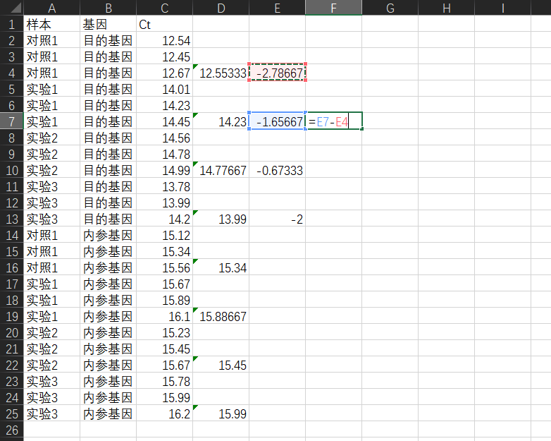 接下来,对于每一个样本,我们用它的目的基因的平均ct值减去内参基因的平均ct值