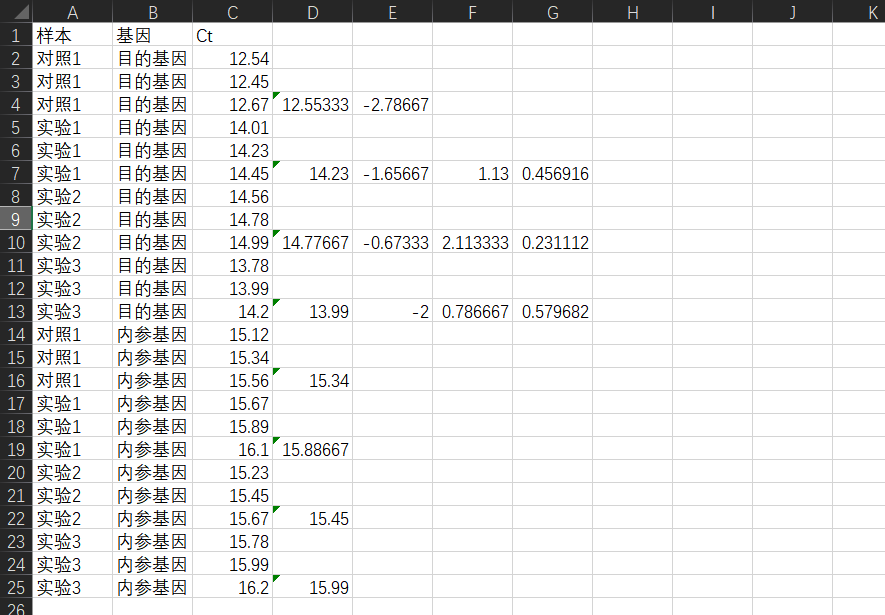 如果担心自己有算错,还可以再次确认。我们知道CT值越小,则表达量越高,在内参基因表达量大致相似的情况下,可以通过判断到对照组的CT值更小,说明对照组的表达量应该更高,符合我们计算的结果,说明计算正确。