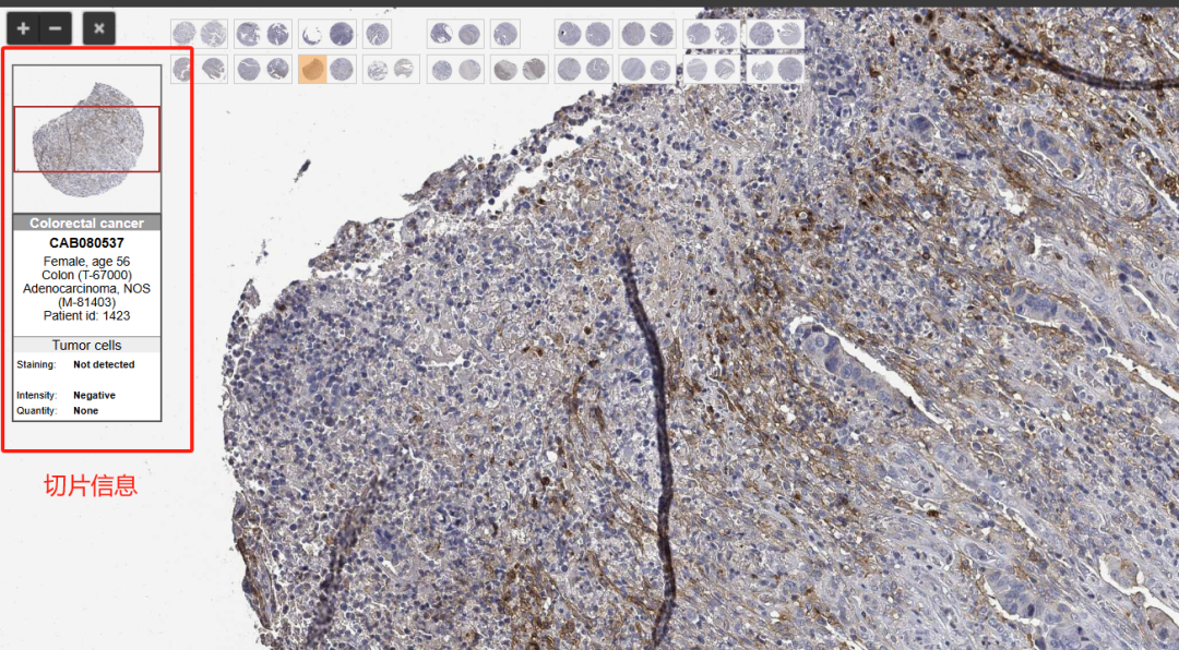 点开IHC结果图以后,右侧会标明切片的样本来源是什么,染色的详情。