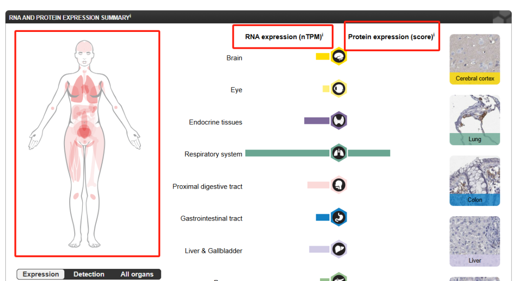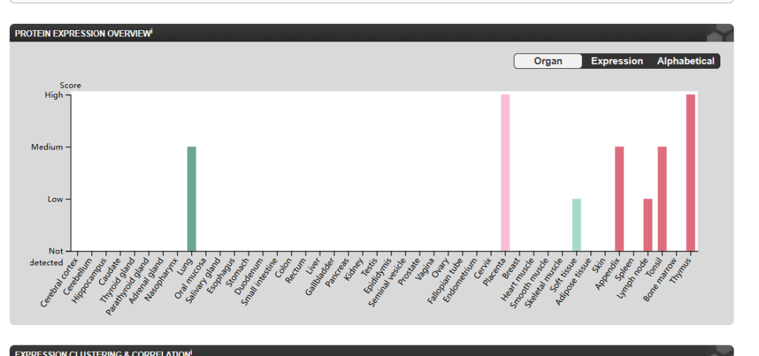 回到刚刚的页面,再往下可以看到PROTEIN EXPRESSION OVERVIEW,可以展示在各个器官中目的蛋白的表达情况。