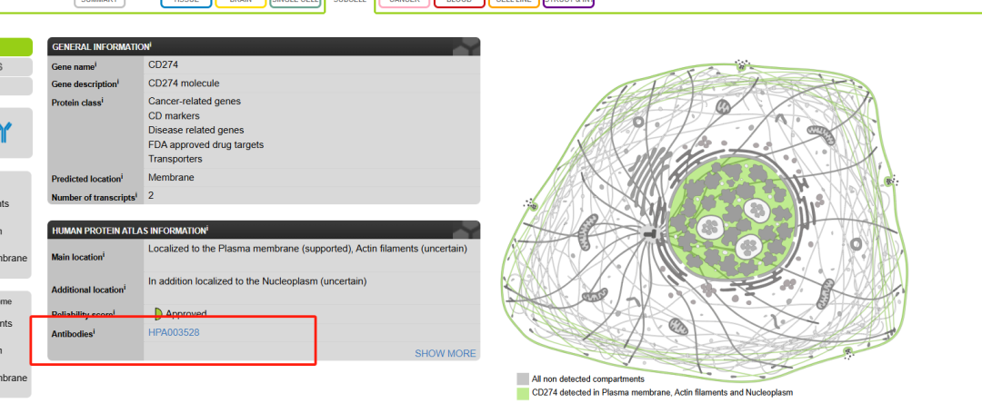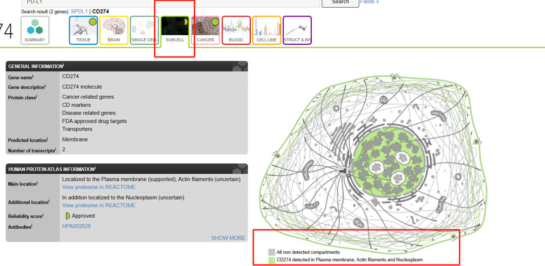 接下来我们可以点击subcell看看细胞定位的情况,可以看到绿色的就是有检测到目的蛋白表达的位置。Reliability score一栏看到注明了半个圆形,这里也是表示数据的可靠程度。
