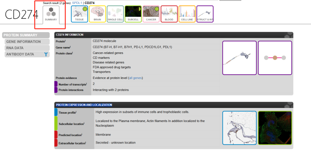 我们直接点击CD274进入详情页面,就可以看到很多详细的信息。首先网页默认进入summary的界面,我们可以看到CD274的基本情况,可以找到我们一开始输入的PD-L1是它的一个别名。