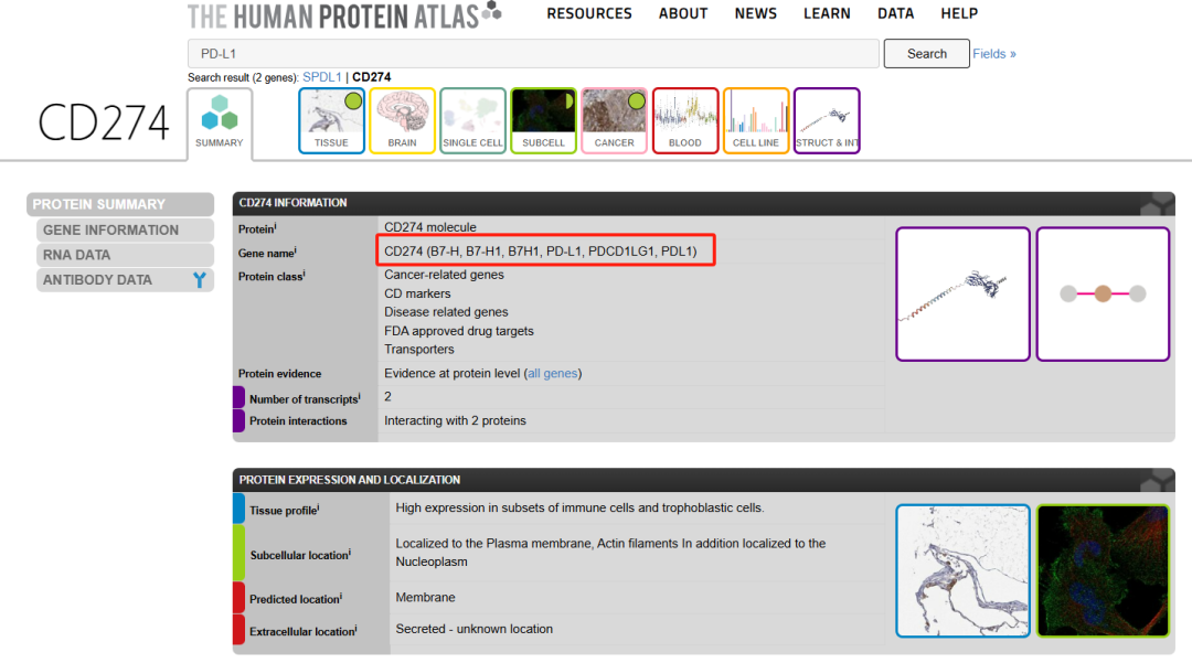 如这里,显示的就是PD-L1的另一个名字CD274。