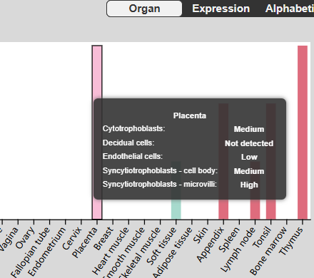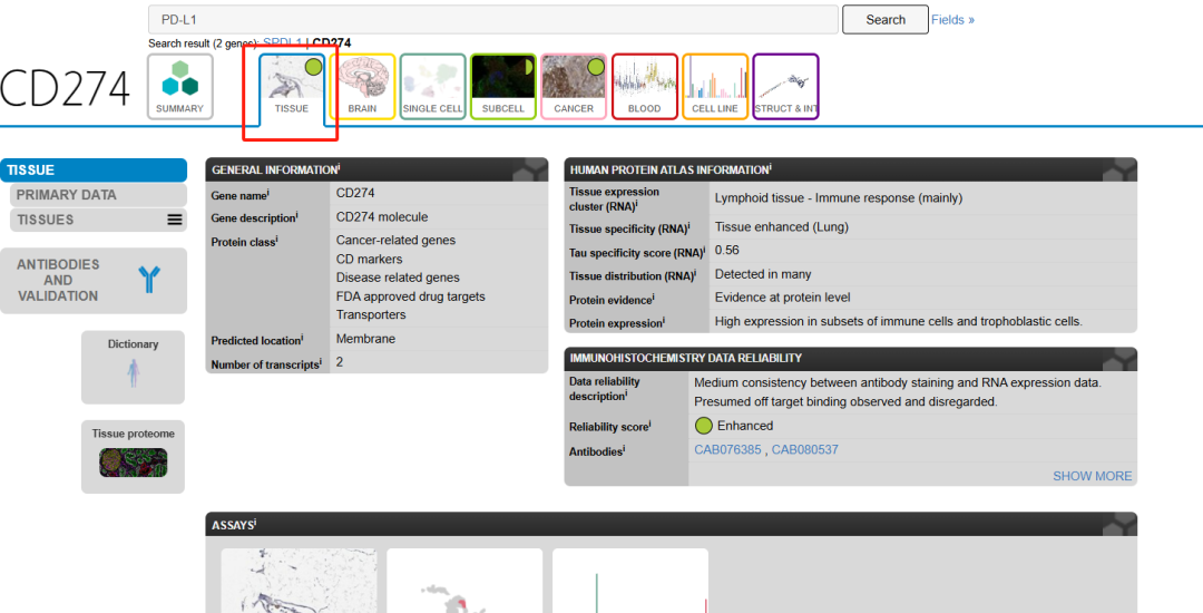 下面几个灰色的框可以查看基本情况。例如:Tissue profile可以看到PD-L1在组织的概况,主要在免疫细胞亚群以及滋养层细胞表达。