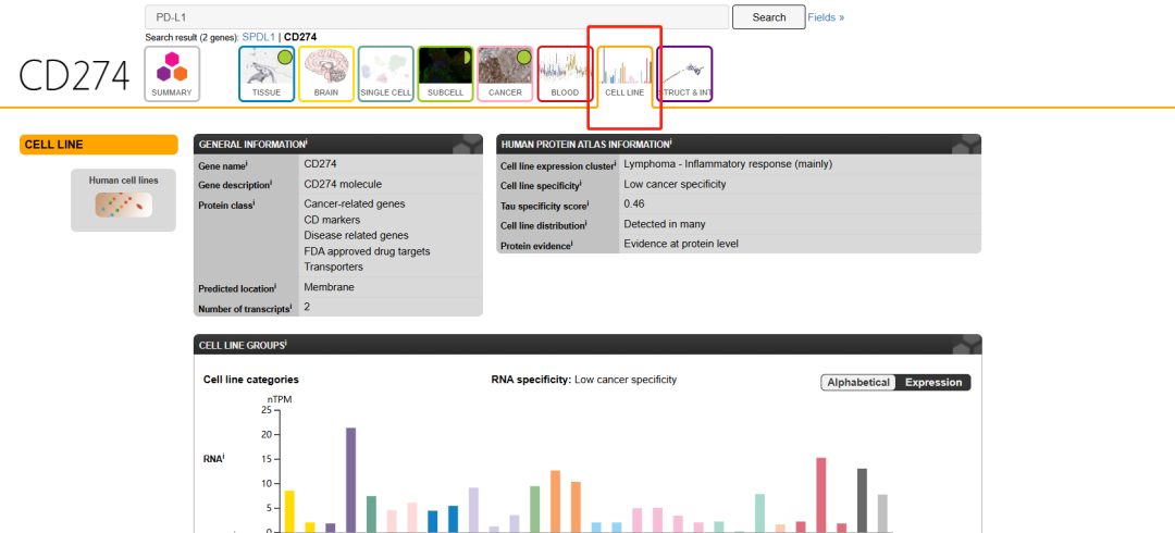点击cell line这里,还可以查看各种细胞系里的表达情况。注意这里提供的也是RNA水平的数据。