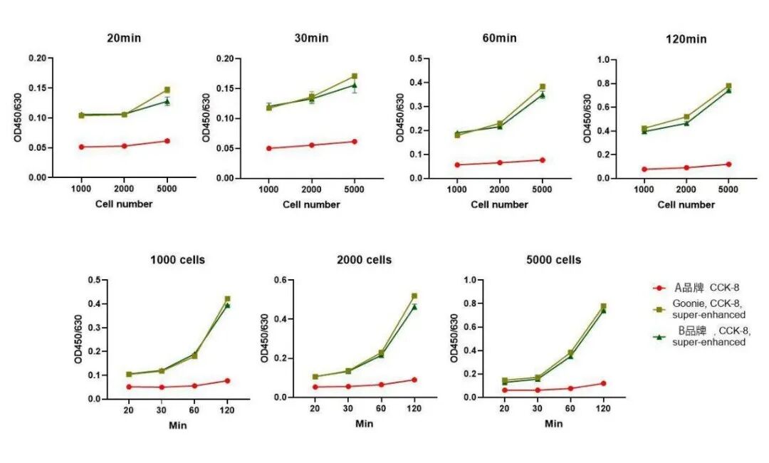 相较于A品牌的普通型CCK-8,Goonie超敏型CCK-8试剂盒经过特别优化,大大缩短了孵育时间,一般仅需0.5-1小时即可获得理想的信号值。这意味着可以更快地得到实验结果,提高实验效率。