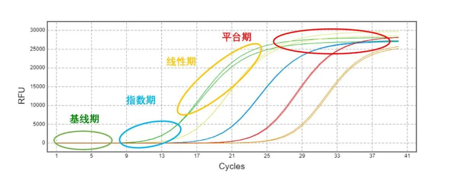 扩增曲线是指扩增过程中产物量随循环次数变化情况的图表,线条呈 “S”型,分为基线期、指数扩增期、线性扩增期、平台期。