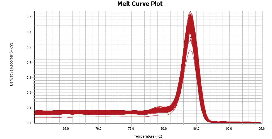 熔解曲线横坐标取温度,而纵坐标则取荧光信号变化的负一次导数(dR/dT)。这样,在熔解曲线上会出现一个熔解温度(Tm)的特征峰,也就是DNA双链解链50%时所需的温度。