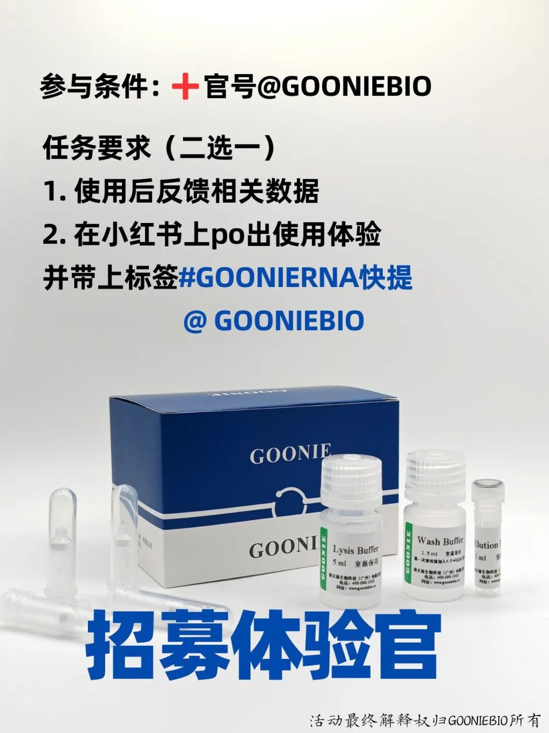 体验官招募活动正在进行当中,10T细胞/组织RNA快提试剂盒free领取,想要的同学,直接向后台私信报名即可。(注:每个课题组仅限一份)